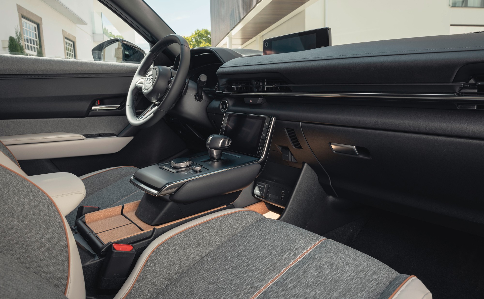 Mottainai is a Japanese expression formed from the words mottai (importance) and nai (lack of something). In short, it means “don’t be wasteful”. Mazda feels passionately about mottainai and is endeavouring to save and recycle as many resources as possible, whether that’s by using renewable energy in the factory, reusing plastics, or using sustainable materials such as cork in its interior design, as in the MX-30 pictured below.