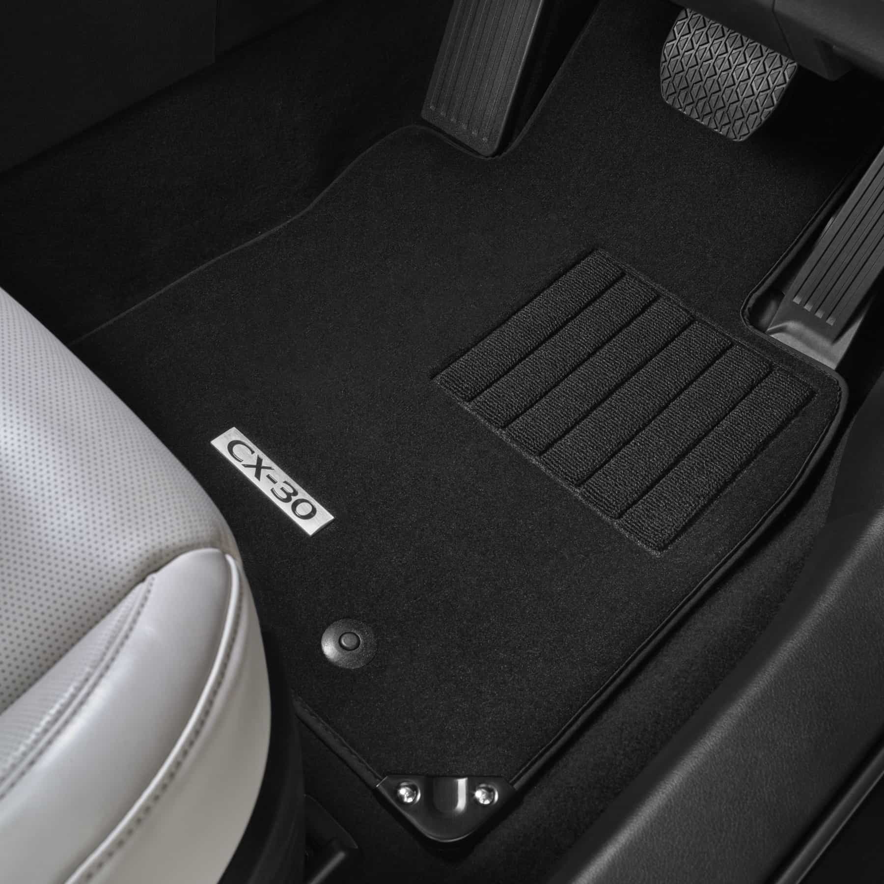 Tailor made to perfectly fit your Mazda CX-30, these slip-resistant, durable floor mats offer an extra layer of protection for your interior carpet and also feature an NVH layer which reduces road noise. Driver and passenger mats include CX-30 branding and black metal corner pieces for that extra premium touch.