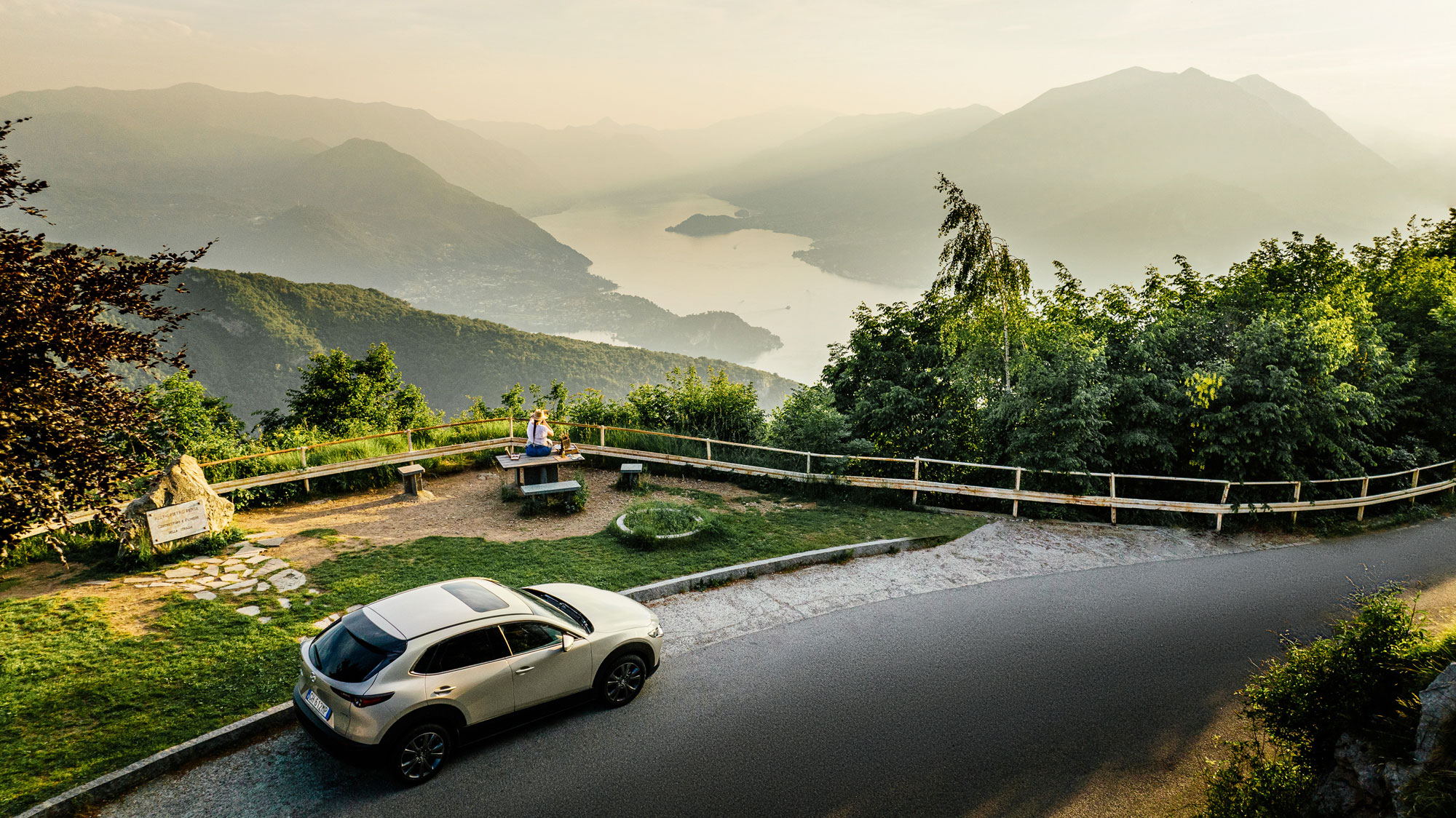 We reach Varenna at the base of the Agueglio Pass – an elaborate scribble of a road – and begin our ascent into the mountains looking for the best vantage point for Sonia to set up her easel. Motorbikes sway past us around blind bends as we slalom slowly up the lush alpine pass. The motion becomes hypnotic as we climb higher into the sky, the CX-30 threading through each corner with poise and precision. With the engine making light work of the steep gradient, soon we are above the slender drifts of clouds that cling to the lake. The mood in the car is serene and companionable as we marvel at the light and discuss art, life, the universe, and everything.