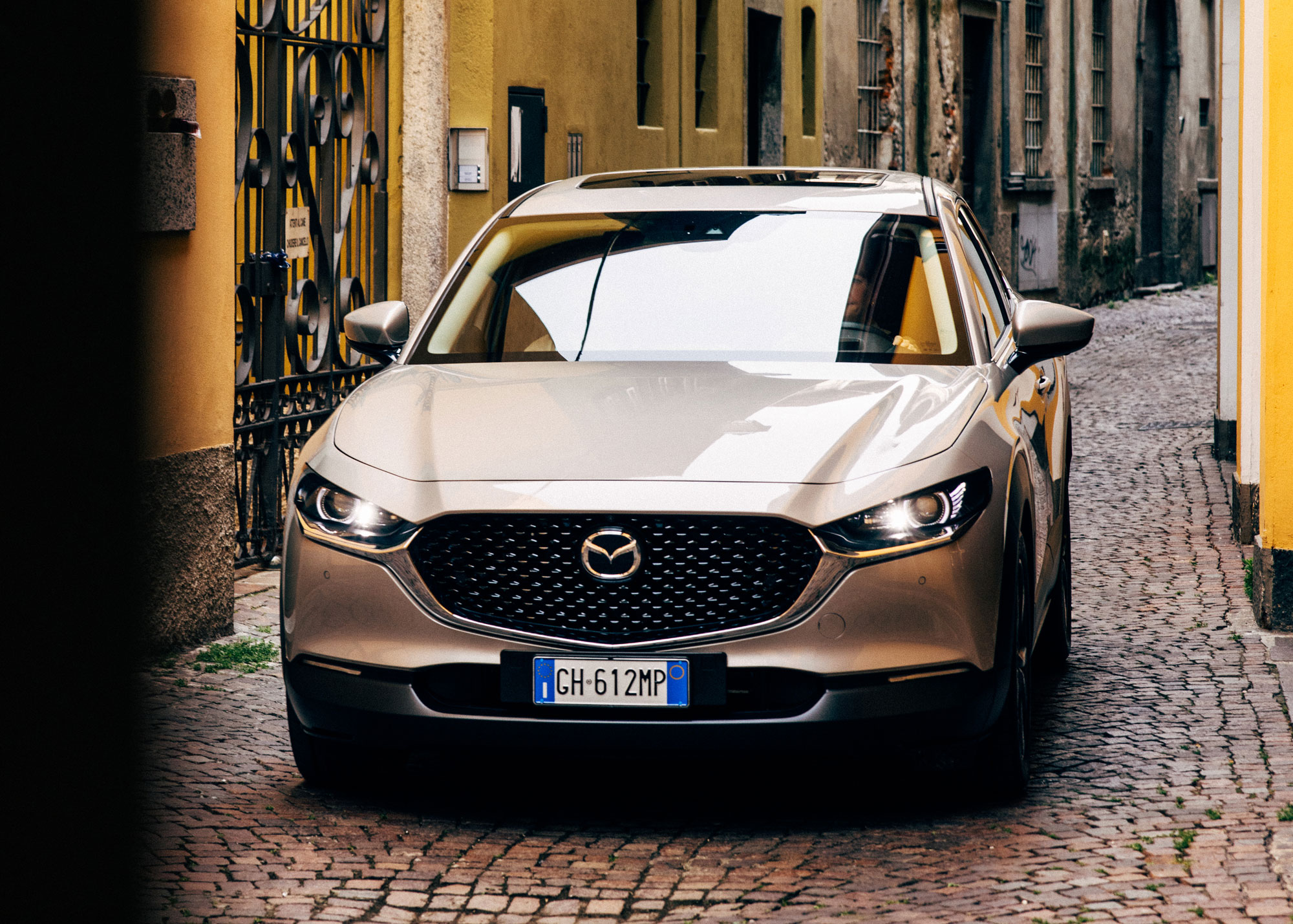 I reflect on the idea that good design, like good technique, is invisible. The roads are challenging here. We navigate impossibly narrow streets, devilish switchbacks and cavalier pedestrians, but the driving is so instinctive, the Mazda CX-30’s performance so seamless, it frees my mind to wander in the clouds as we drive. We orbit the lake through sun and shadow-striped tunnels. Ice-cream-coloured villas line the elegant streets in lemon and pistachio tones, framed by grand cypress trees and vivid magenta geraniums.