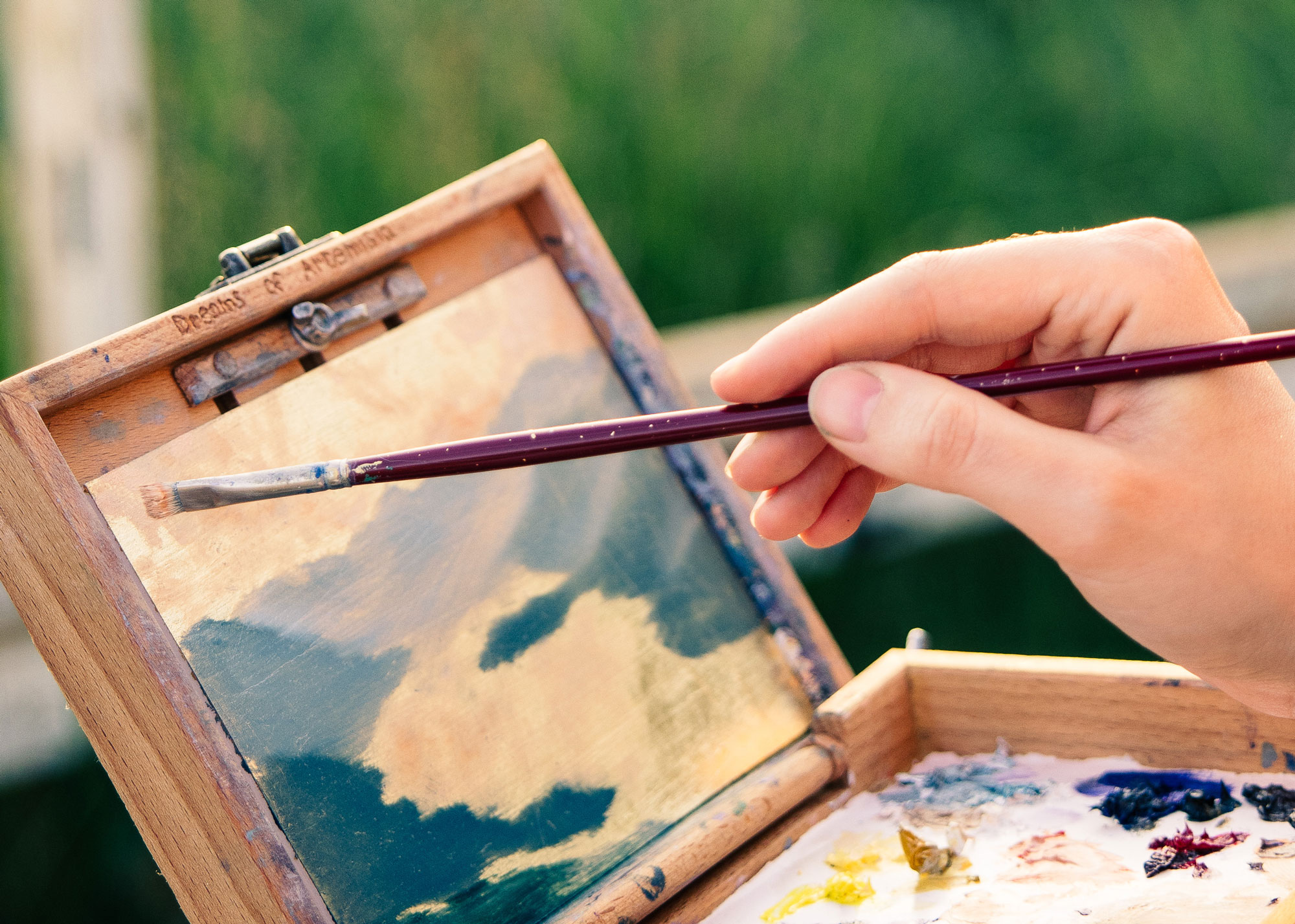 Sonia disappears into her work, depositing glossy blobs of titanium white, burnt sienna and vermilion oils onto her palette, deftly mixing them into a more delicate spectrum. The depth of the gold canvas gently reflects her movements through translucent layers of paint in a dreamy metamorphosis.