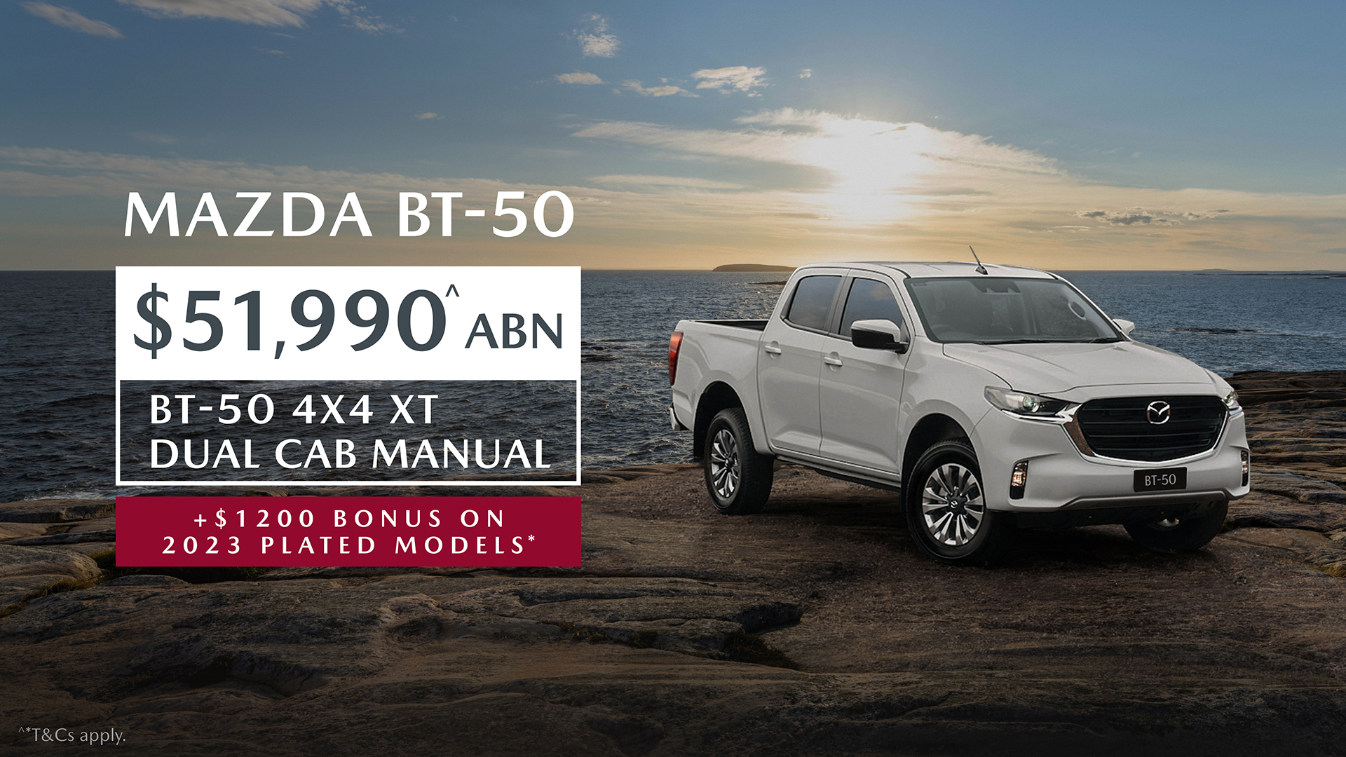 ^Driveaway pricing offer valid for ABN holders on BT-50 4x4 XT Manual dual cab models only. 12 months registration, 12 months compulsory third party insurance, stamp duty, other applicable statutory charges, dealer delivery and administration charges included. Final pricing may vary according to your personal circumstances. Premium paint not included.