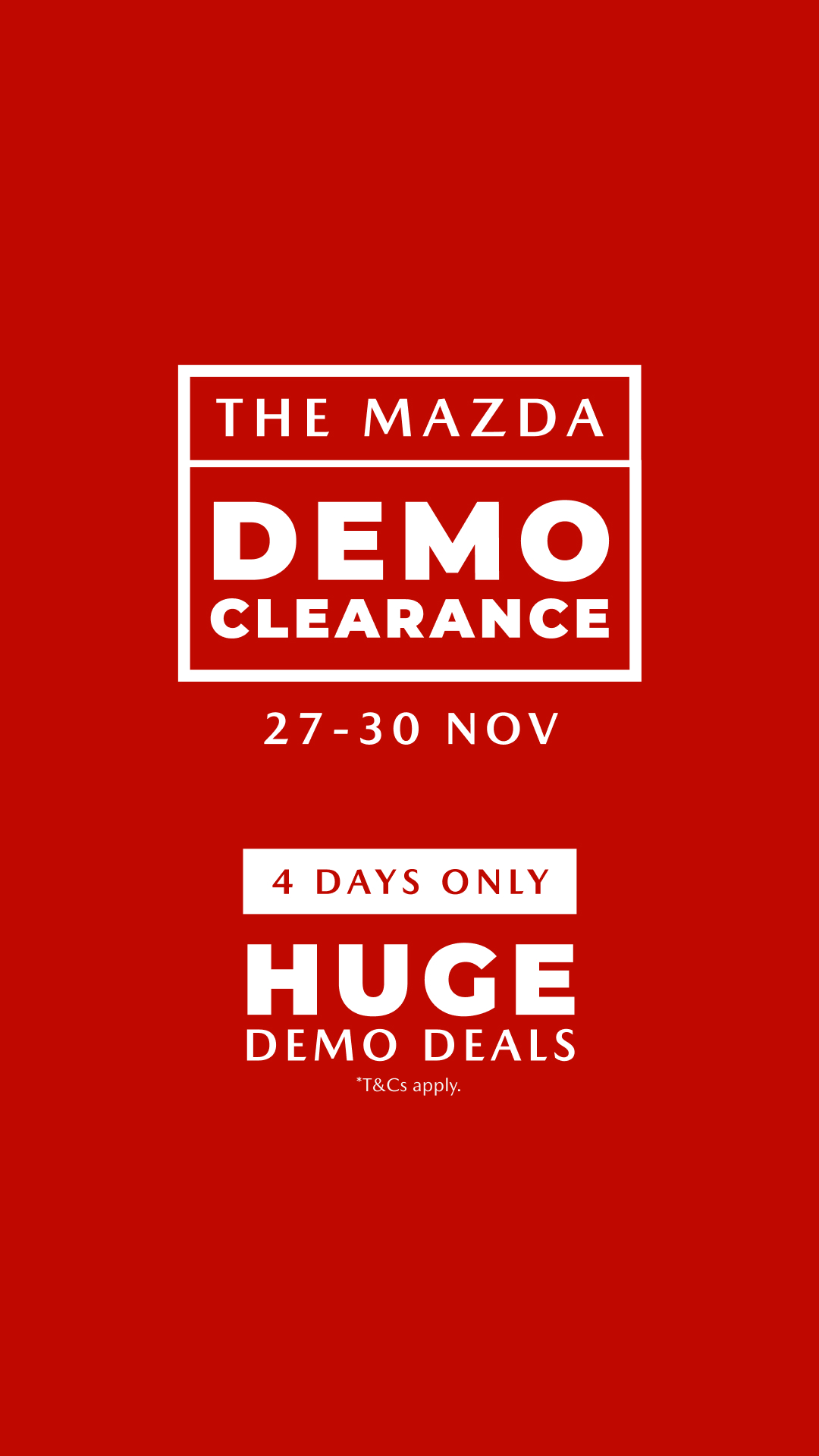 For 4 days only. Don't miss huge deals* on the Mazda demo range. Price to clear and ready to move, visit your local Mazda dealership to explore the range.