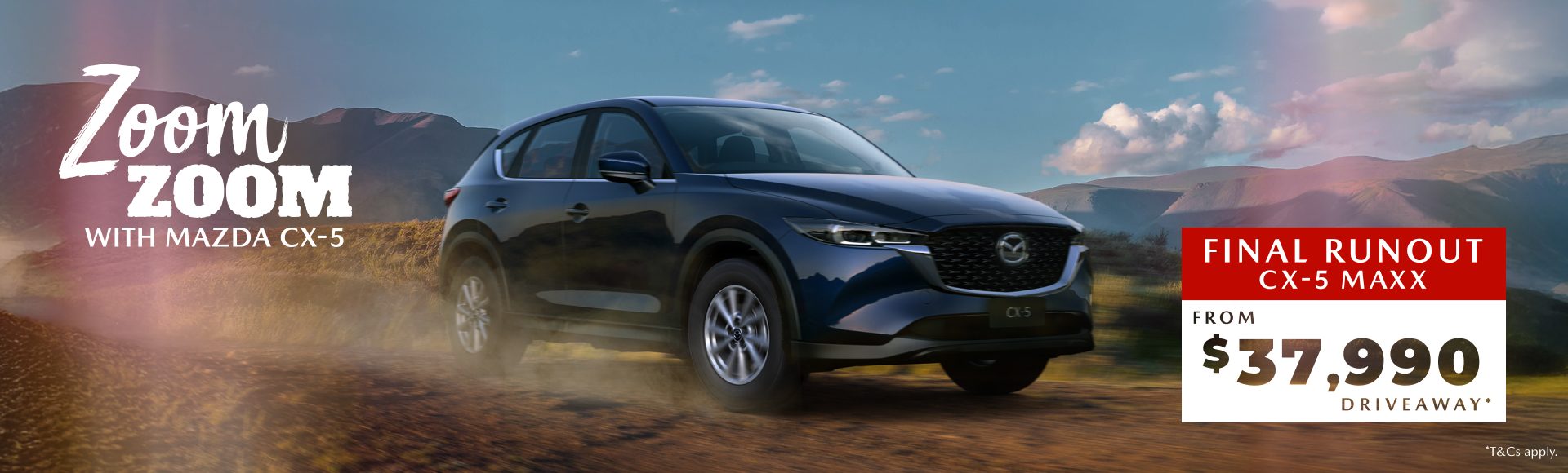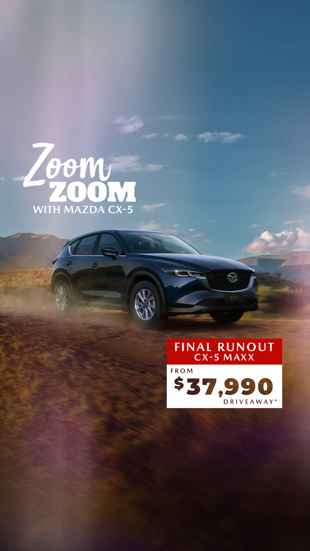 *Runout pricing offers only valid on CX-5 P models whilst stocks last. 12 months registration, 12 months compulsory third party insurance, stamp duty, other applicable statutory charges, dealer delivery and administration charges included. Final pricing may vary according to your personal circumstances. Offer subject to change. Mazda reserves the right to change or amend the offer at any time.